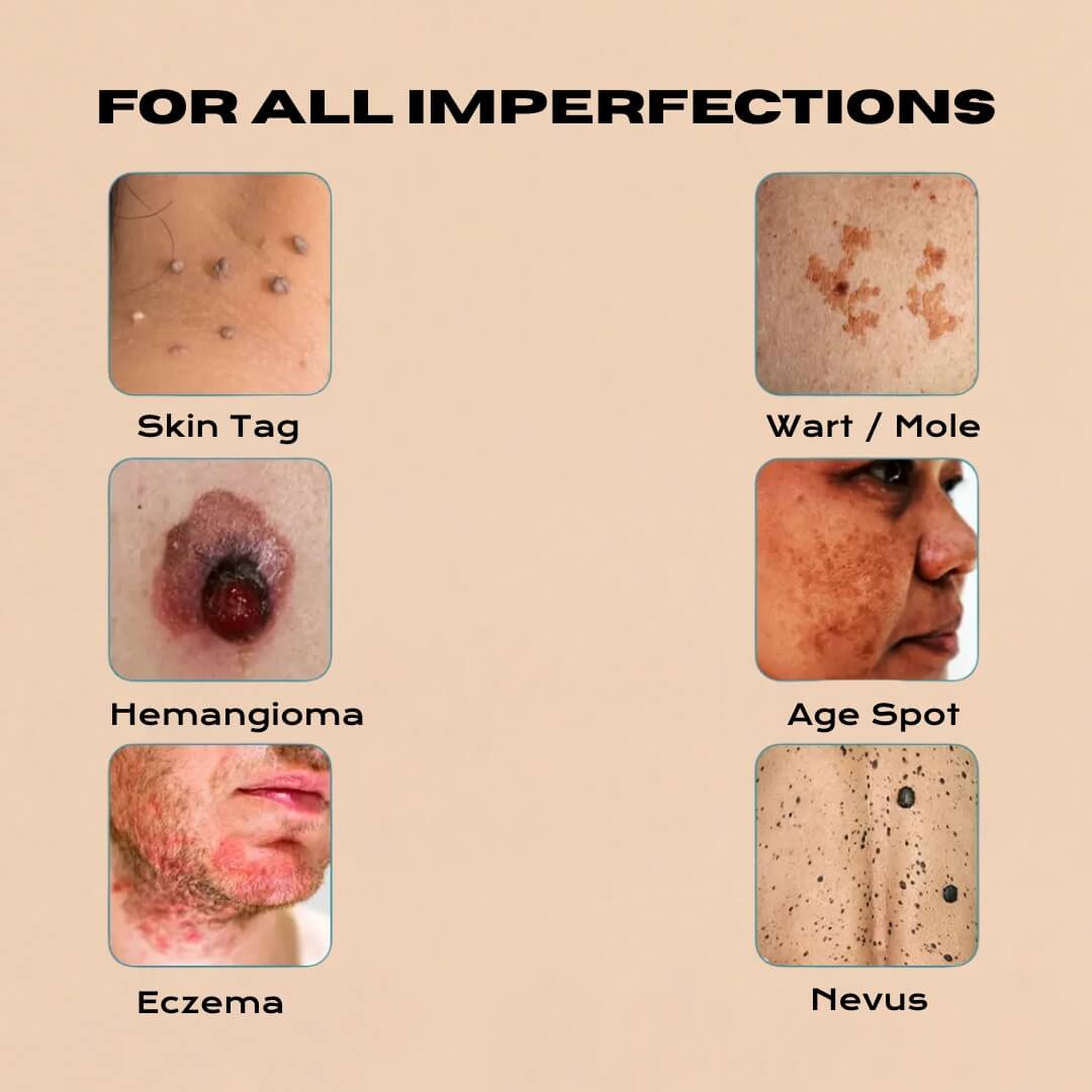 It’s effective for a wide range of benign skin imperfections, including skin tags, beauty marks, warts, angiomas, milia seeds, small pigmentation spots, and more.